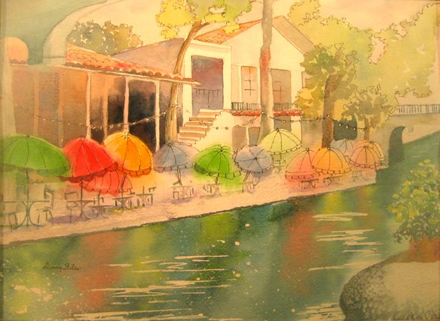 This is a painting I started awhile ago from a photo I took at the River Walk in San Antonio. It's a famous location for paintings...I've seen quite a few in art magazines and at shows. If you walked along this lovely spot you will instantly remember it. In the evening it is strung with tiny lights. Rental boats (like Venice) quietly motor up and down the river (at all times of day). They look more like pontoons than gondolas, however, but they are painted in bright colors and have interesting guides that chat as you go. Music from the restaurants and night clubs along the river float out onto the quiet evening. There are many bridges crossing the river (you can barely see one in the distance).